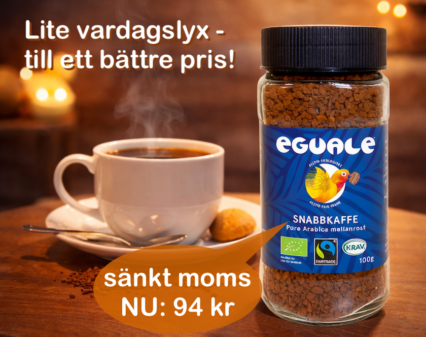 Idag sänker jag momsen på den enda produkt i min butik som är en "matvara" – och det gäller ett snabbkaffet som många av er redan tycker om: Eguale Pure Arabica Snabbkaffe.